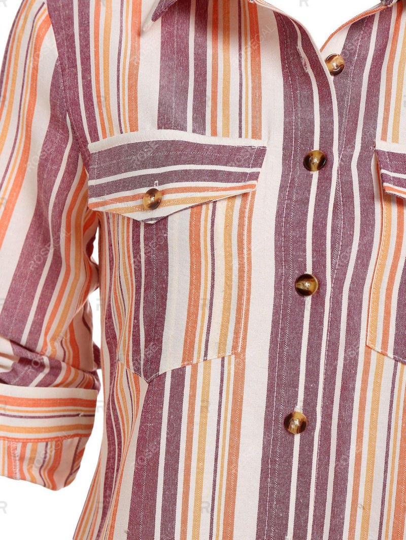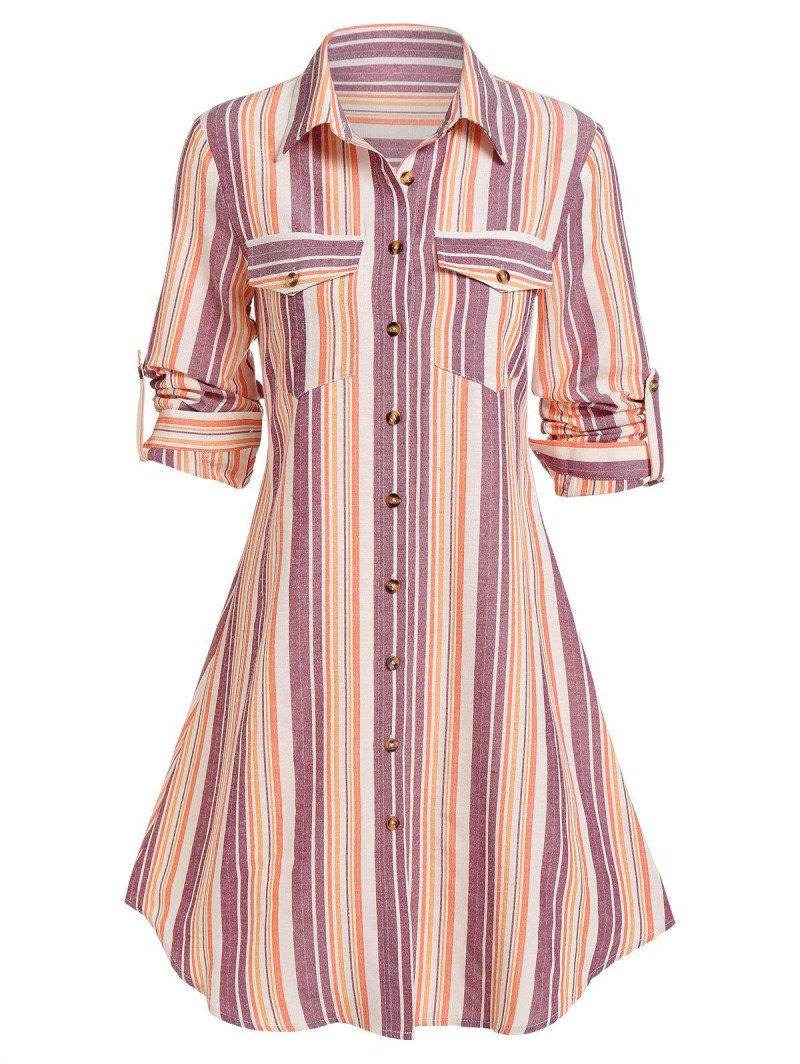 Double Pockets Striped Print Shirt Dress