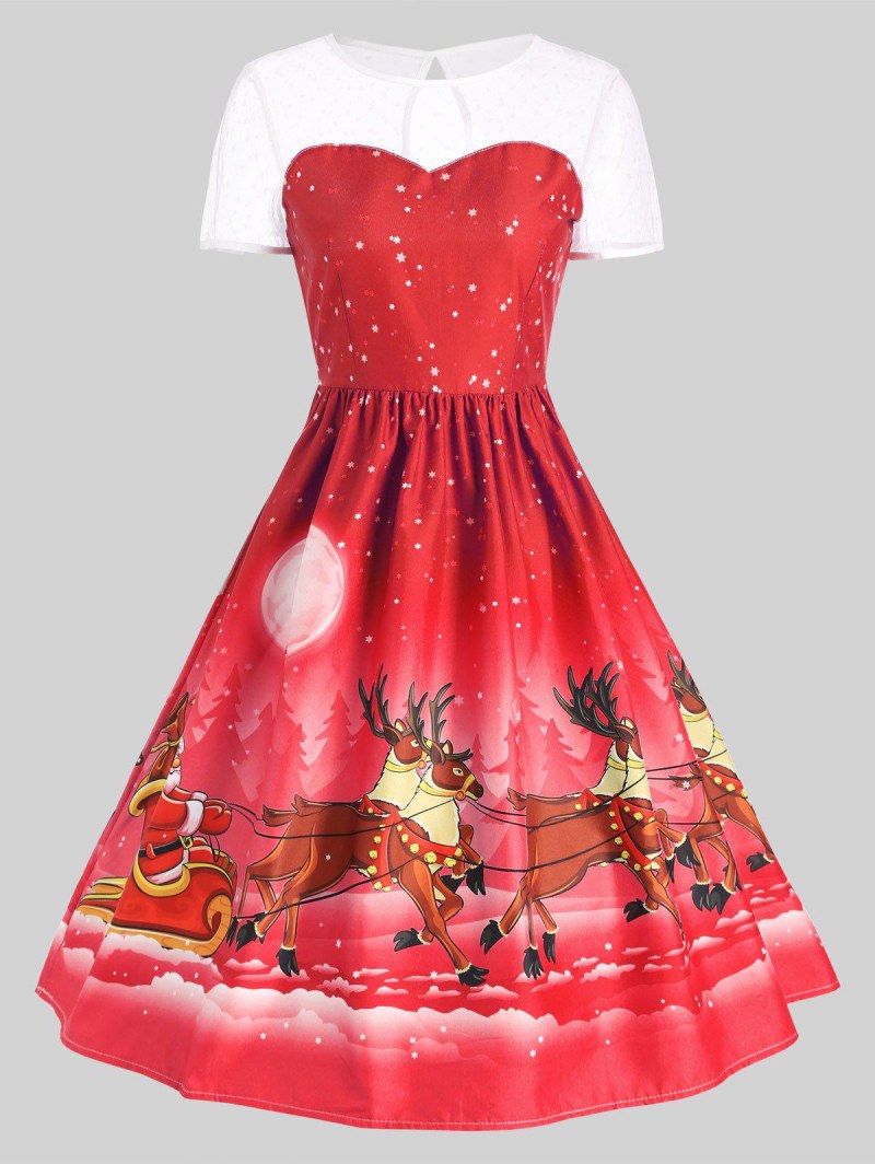 Mesh Panel Christmas Santa Claus Sleigh Party Dress