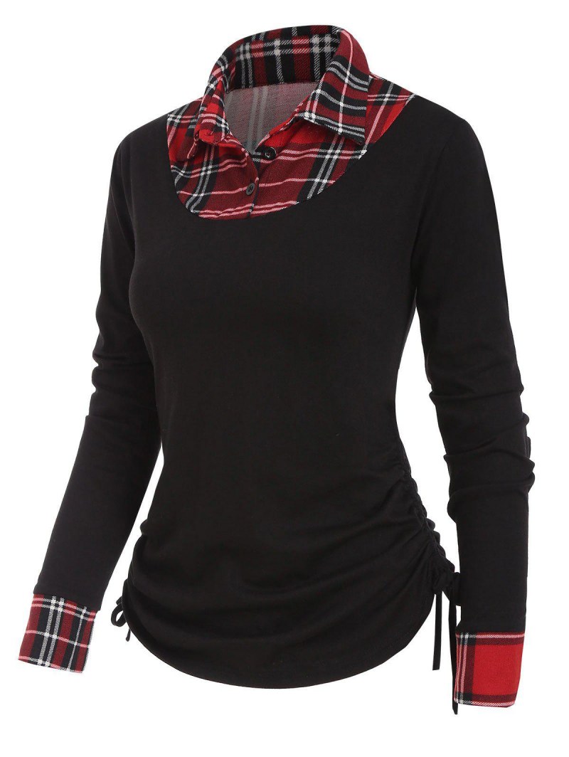 Button Placket Shirt Collar Plaid Insert T-shirt